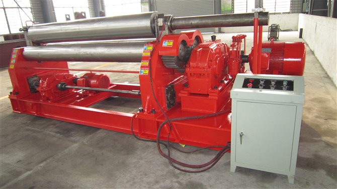 本機(jī)結(jié)構(gòu)型式為三輥對稱式,上輥在兩下輥中央對稱位置作垂直升降運(yùn)動,通過絲桿絲母蝸桿傳動而獲得,兩下輥?zhàn)餍D(zhuǎn)運(yùn)動,通過減速機(jī)的輸出齒輪與下輥嚙合,為卷制板材提供扭矩,本機(jī)床結(jié)構(gòu)緊湊,操作維修方便。